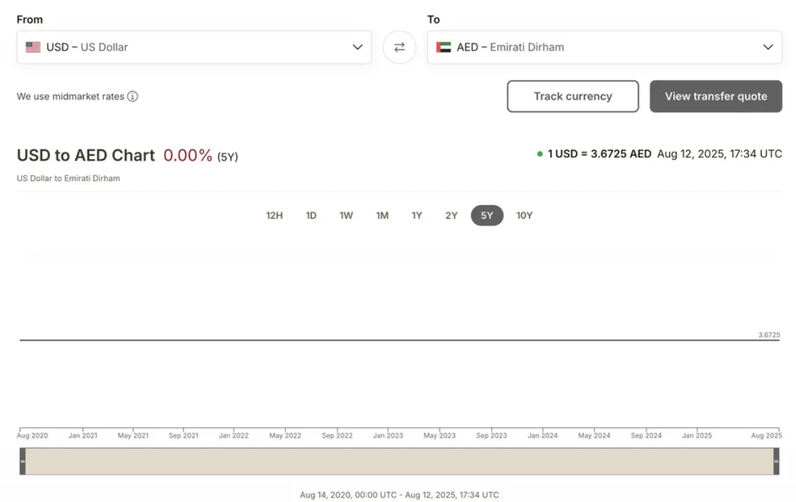Fixed rate of 3.6725 AED to 1 USD.